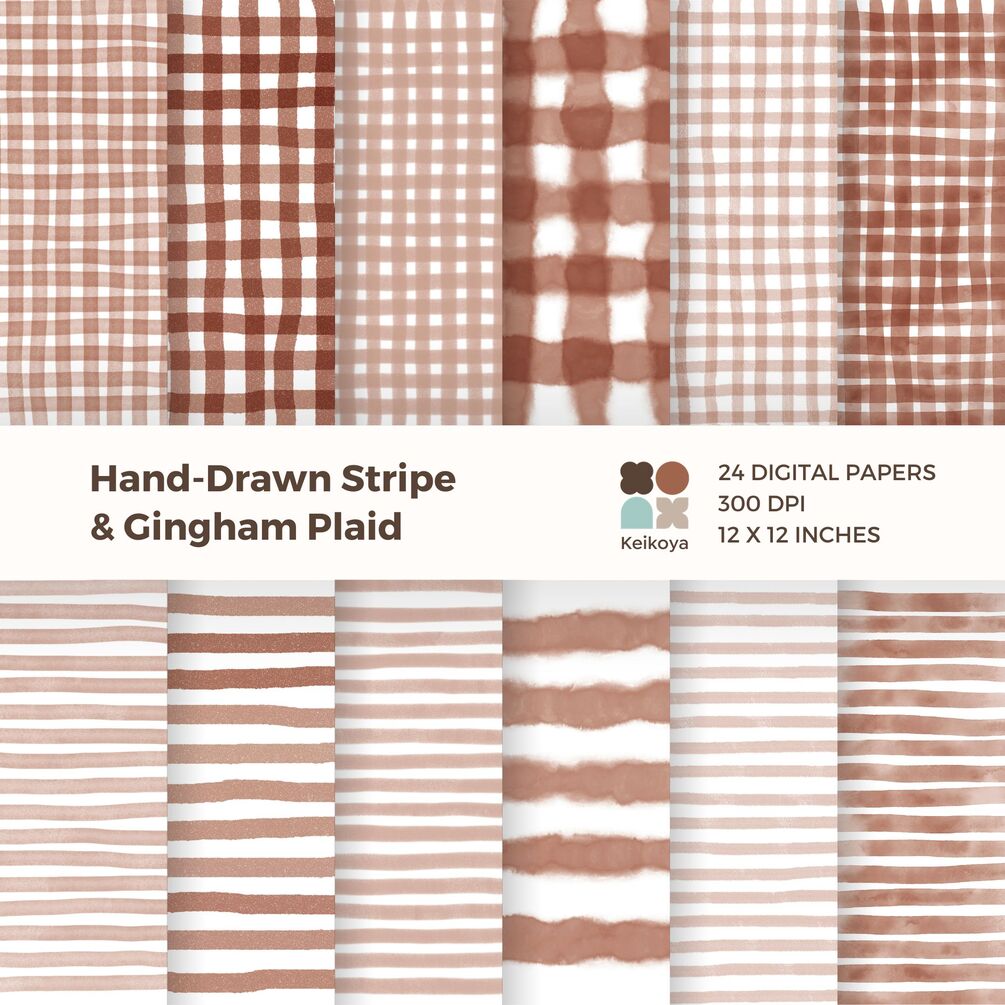 24 Hand-Drawn Digital Papers | Gingham Plaid & Stripe | Brown