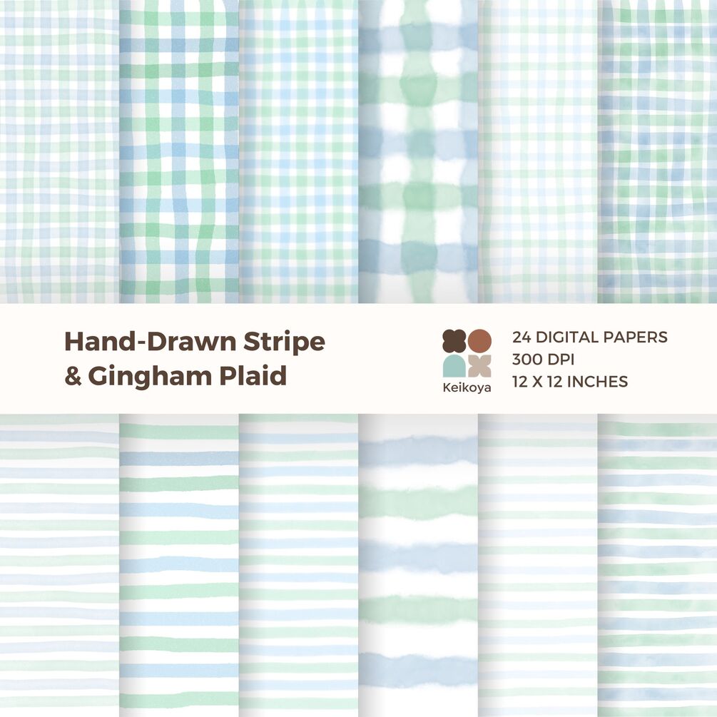 This carefully curated set boasts 24 enchanting designs, including 12 hand-drawn check patterns and 12 chic stripes, each lovingly crafted with a blend of watercolor, crayon, and marker elements for that soft, artistic appeal.