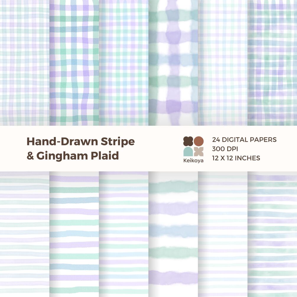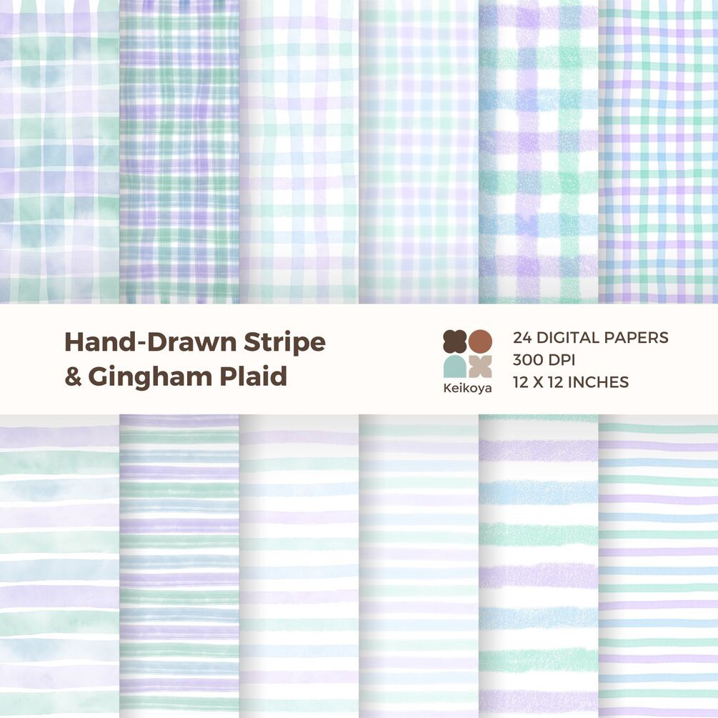 This carefully curated set boasts 24 enchanting designs, including 12 hand-drawn check patterns and 12 chic stripes, each lovingly crafted with a blend of watercolor, crayon, and marker elements for that soft, artistic appeal.