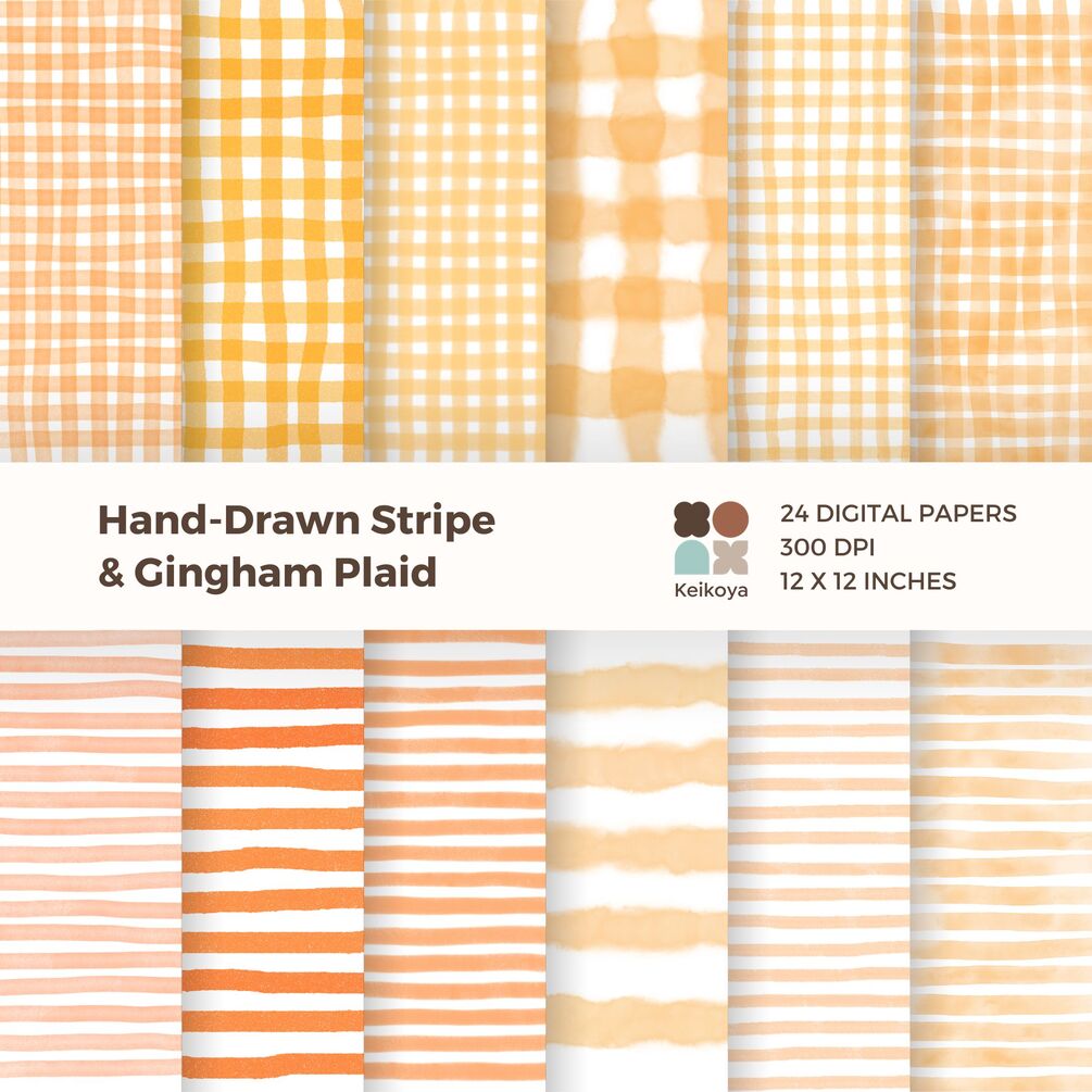24 Hand-Drawn Digital Papers | Gingham Plaid & Stripe | Orange