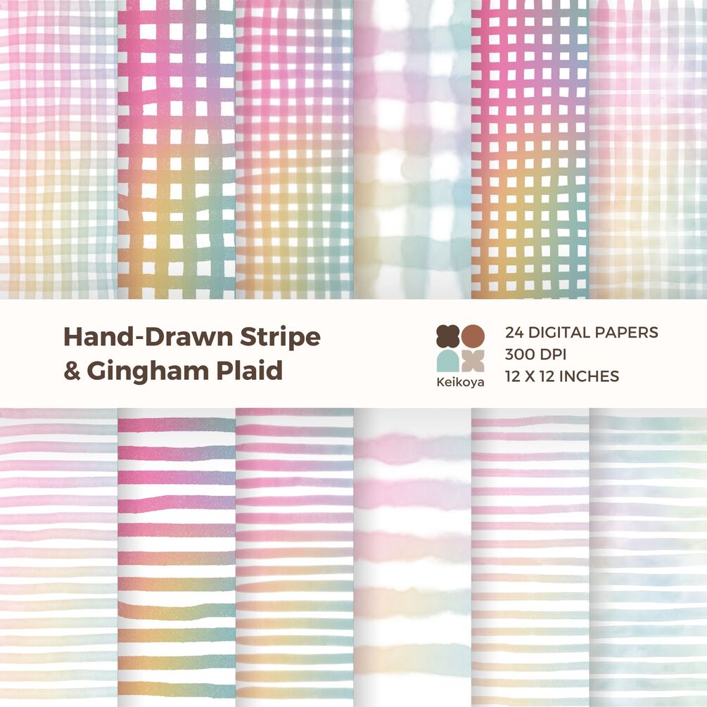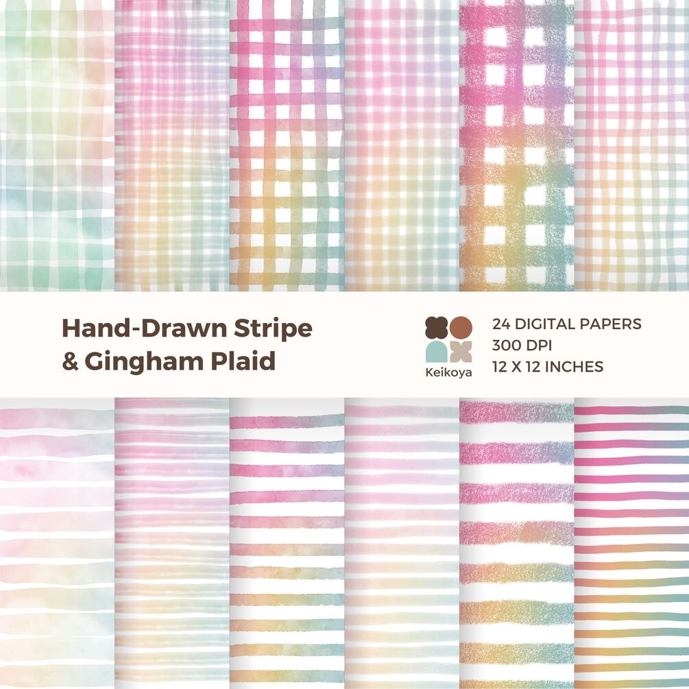 This carefully curated set boasts 24 enchanting designs, including 12 hand-drawn check patterns and 12 chic stripes, each lovingly crafted with a blend of watercolor, crayon, and marker elements for that soft, artistic appeal.